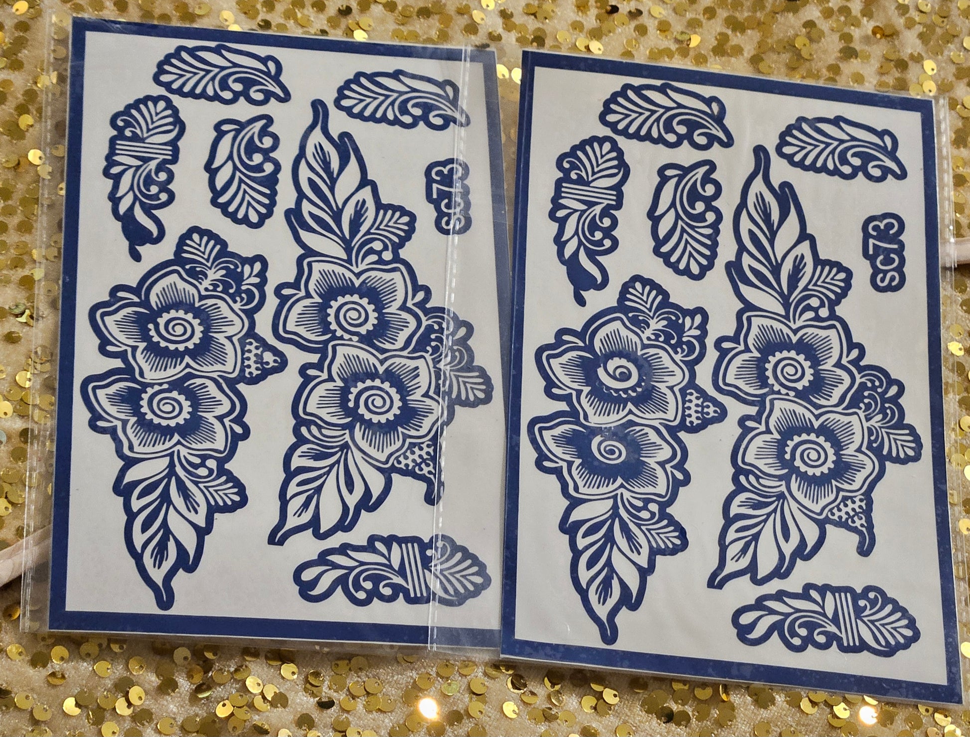 Immerse yourself in the beauty of 'Floral Essence,' a captivating collection of henna stencils featuring intricate floral and leaf designs. Each stencil is meticulously crafted to add a touch of elegance and charm to your henna art, perfect for any occasion. Let your creativity flourish with these stunning patterns that blend traditional henna artistry with modern sophistication.