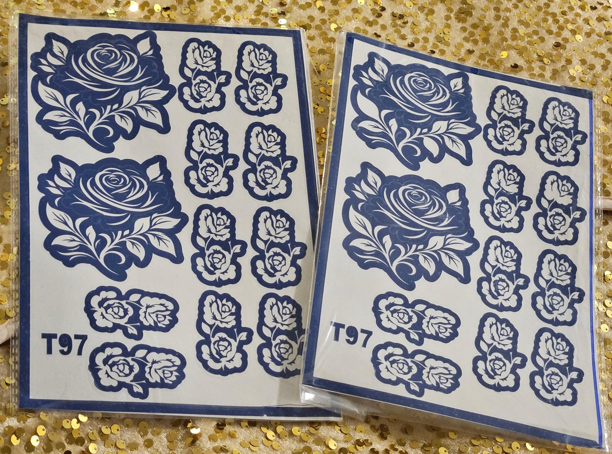 Introducing 'Rose Delight,' a stunning collection of henna stencils featuring beautifully detailed rose designs. Each sheet showcases a large rose, a smaller rose with leaves, and ten individual roses, perfect for adding a touch of elegance to your henna art. Let your creativity blossom with these enchanting patterns!